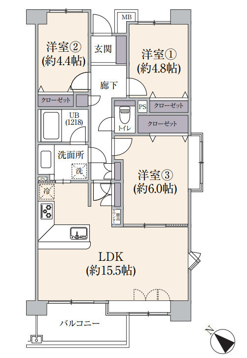 7F LDK 15.5帖 、7F 洋 6.0帖 、7F 洋 4.8帖 、7F 洋 4.4帖