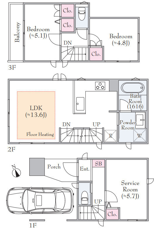 1F S(納戸) 5.7帖 、2F LDK 13.6帖 、3F 洋 5.1帖 、3F 洋 4.8帖