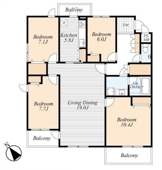 2F LDK 19.0帖 、2F 洋 10.4帖 、2F 洋 7.7帖 、2F 洋 7.1帖 、2F 洋 6.0帖